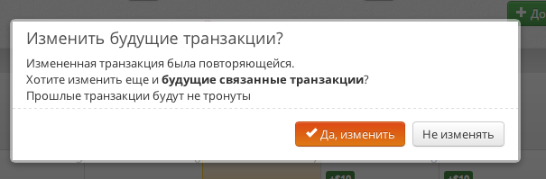 Эти цепочки можно разделять на произвольные фрагменты. Для этого нужно изменить одно из повторений и ответить «Да, изменить и все будущие». Например, отпуск начинается с 21-го числа. Меняем что угодно в транзакции: