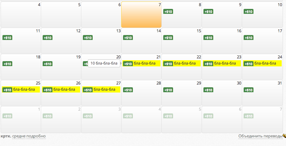 Любой пользователь ХаниМани может легко запланировать часто повторяющиеся доходы или расходы. Это могут быть как мелкие траты на еду, походы в кино, так и большие - зарплаты, оплата жилья и т.д. Но жизнь не всегда идёт столь размеренно, как нам бы этого хотелось. А иногда нам самим хочется разбавить её чем-нибудь ярким :) И тогда части запланированных доходов/расходов просто не происходит. Если это единичный случай, то его легко уладить. Но что если вы внезапно уехали в отпуск, или переехали в новую квартиру, и временно потеряли доступ к интернету? При возвращении к обычной жизни вас ждет куча рутинной работы по удалению неподтвердившихся планов. Обидно так тратить свое время, правда? Главный принцип ХаниМани — это забота о своих пользователях. Поэтому для таких ситуаций реализовано очень простое решение. Повторяющиеся доходы/расходы в системе связаны друг с другом цепочками. При наведении на одно из повторений подсвечиваются и все остальные: